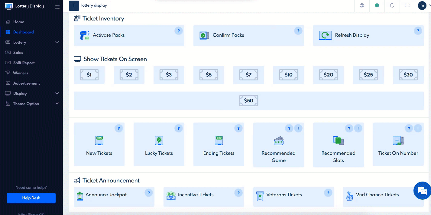 We recommend you keep the dashboard open at all times to quickly engage customers and help them choose their tickets, this builds customer loyalty by giving them one of a kind lottery buying experience.