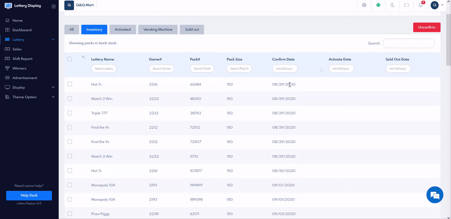 You can search by Lottery Name, Game number, Pack number, Pack size, confirm the date, and activation date.